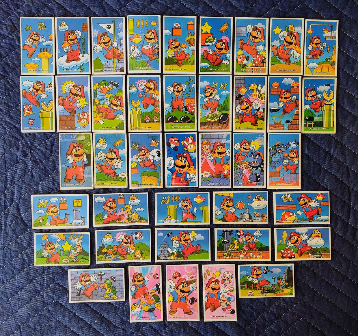 Through much research and with the help of my contacts and collectors in Japan, we now know there are 40 Menkos in the 1985 Super Mario Bros Menko set. Since I found out directly from Amada (Ensky Plus) that they didn't keep specific records of the production of these Menkos, I had to use other methods to figure this out. Several dealers and collectors I know in Japan through the years have tried to collect all the different scenes of Menkos in this set when they acquired large lots of Menkos. Every time they put together all the different scenes in this set, they always ended up with 40 Menkos. I also know a collector in Japan that collected these cards in the late 1980's not long after these Menkos were released. He collected hundreds of these particular Menkos and when he put together a set of all the different scenes, he ended up with 40 Menkos every time. All of this combined with years of research online looking at all the different Menkos that sold and are available for sale, I have determined with a 95% certainty that there are 40 Menkos in this set. There are only a few exceptions. There are a few other Mario Menkos dated 1985, but the scene and the information on the card tells us it is not part of this set. The scenes of the Menkos in this set is obvious and unmistakable. They have a very distinct blue sky background. The only other exception is the round Menkos have just a few different scenes dated 1985, but again you can tell they are not part of this set.